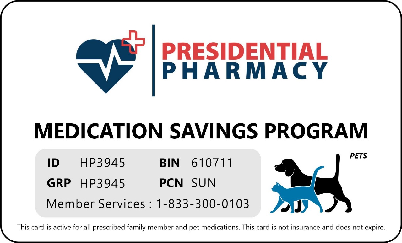 Presidential Pharmacy is always active with no registration to complete, and no setup or subscription fees.