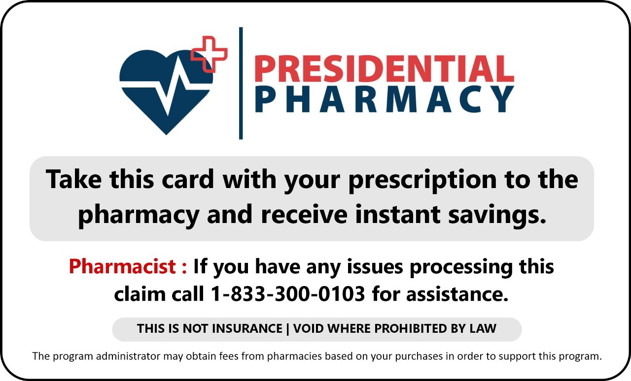 The Presidential Pharmacy medication savings program provides discounts of up to 87% off retail prices at all major chains and most independent pharmacies nationwide.